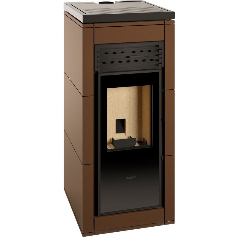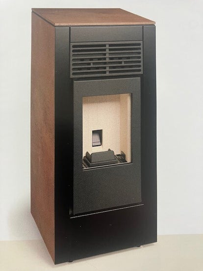 Standaard bovenaansluiting. Leverbaar in 6,8 en 10 kW in steenachtig materiaal grijs of roestkleur.