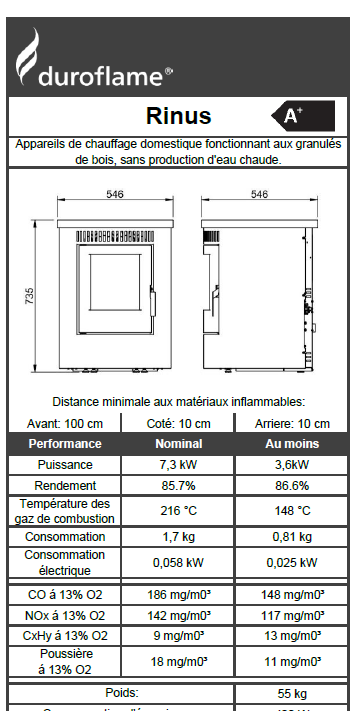 Deze pelletkachel heeft een vermogen van 7,3 kW en een minimaal verbruik van 0,79 kilo per uur (max 1,7 per uur).
