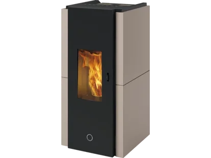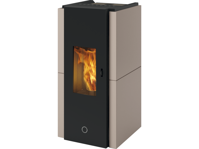De luchtdichte pelletkachel van 7,5 kW met een modern vierkant en lineair design, zonder roosters aan de voorzijde, met stalen deuren en zijkanten. Het lichaam van de kachel, iets hoger dan de zijkanten, creëert een bijzonder spel van geometrieën.