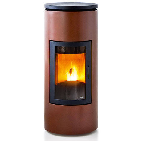 De MCZ TUBE 8 kW, een prachtig Italiaans design: een ronde minimalistische pelletkachel zonder zichtbare warme luchtroosters aan de voorzijde.