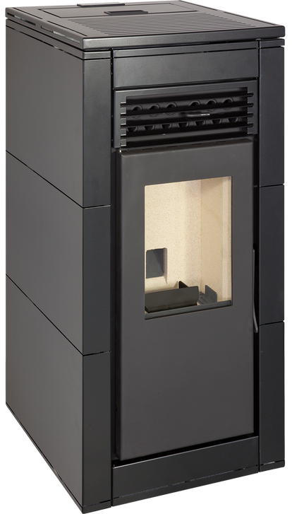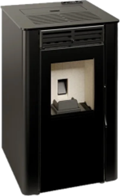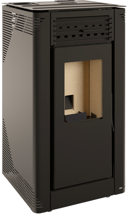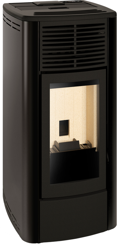 De Aura is een pelletkachel met veel vermogen. nl., hij is leverbaar in 12 en in 15 kW en alleen in zwart.