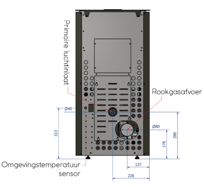 De Nova N7 heeft standaard een rookgasafvoer aan de achterzijde maar kan tegen meerprijs ook met bovenaansluiting worden uitgevoerd.